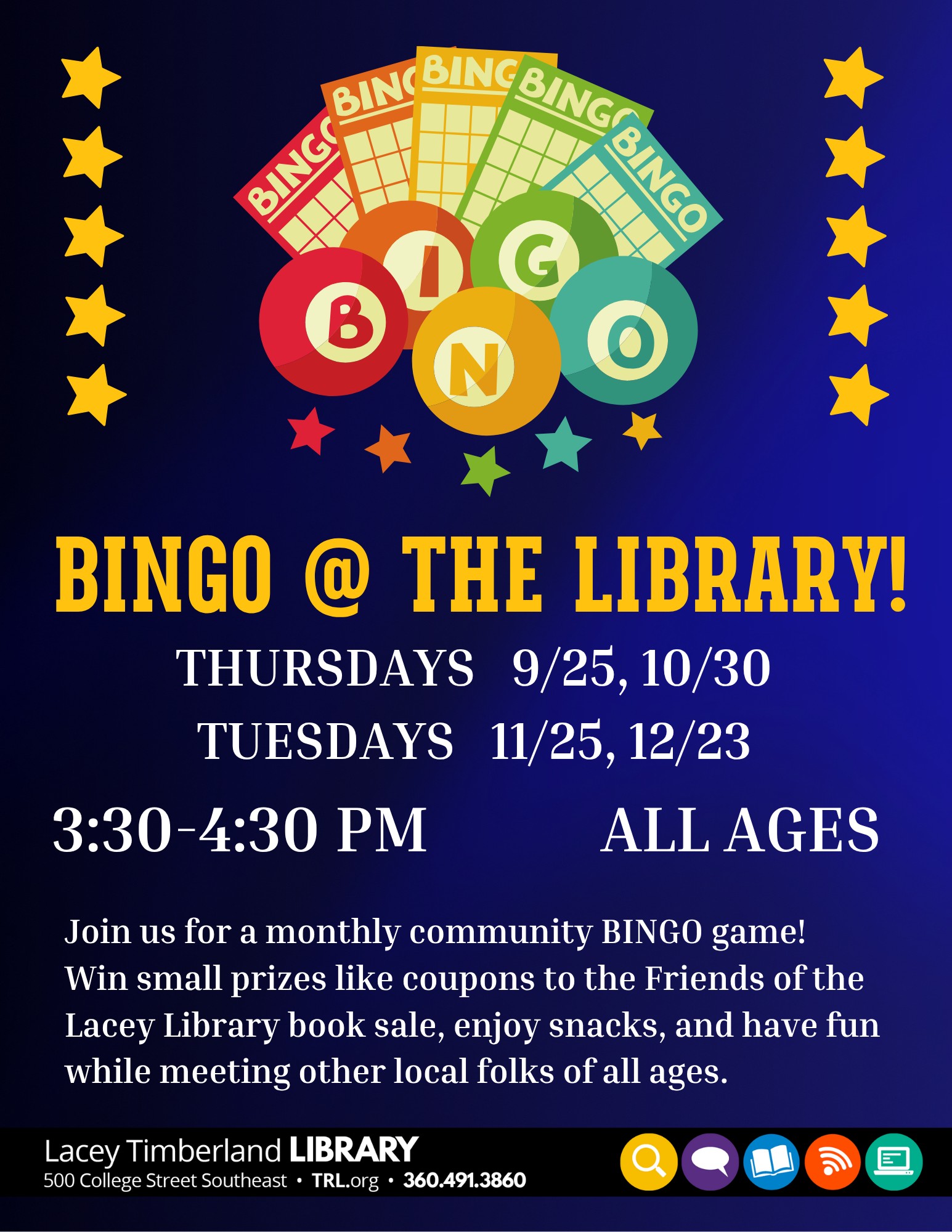 Supported by the Friends of the Lacey Library Bingo at the Library! Oct. 30, @ 3:30-4:30 p.m. July 19, 2025 webmaster