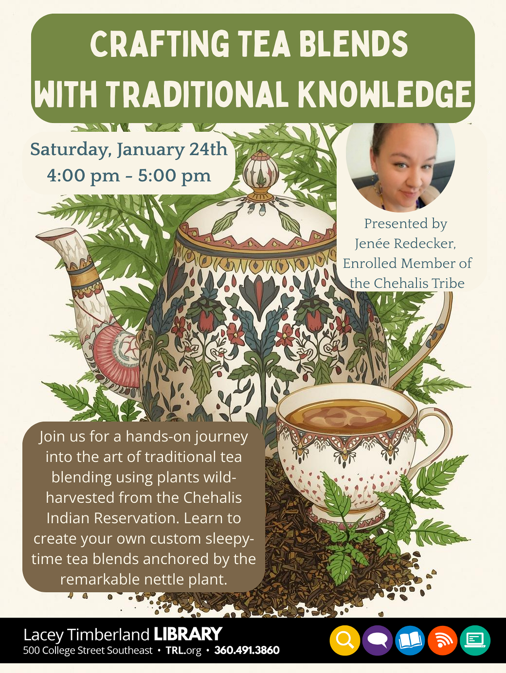 Join us for a hands-on journey into the art of traditional tea blending using plants wild-harvested from the Chehalis Indian Reservation. Learn to create your own custom sleepy-time tea blends anchored by the remarkable nettle plant.